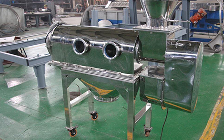 本設(shè)備篩網(wǎng)為圓筒狀,置于機(jī)體內(nèi),物料通過(guò)螺旋輸送系統(tǒng)后,和氣流混合、霧化進(jìn)入圓筒內(nèi);通過(guò)網(wǎng)筒內(nèi)風(fēng)輪葉片使物料受離心力和旋風(fēng)推進(jìn)力,從而迫使物料噴射過(guò)網(wǎng),由細(xì)料排出口排出,不能過(guò)網(wǎng)的物料沿筒壁從粗料排出口排出。